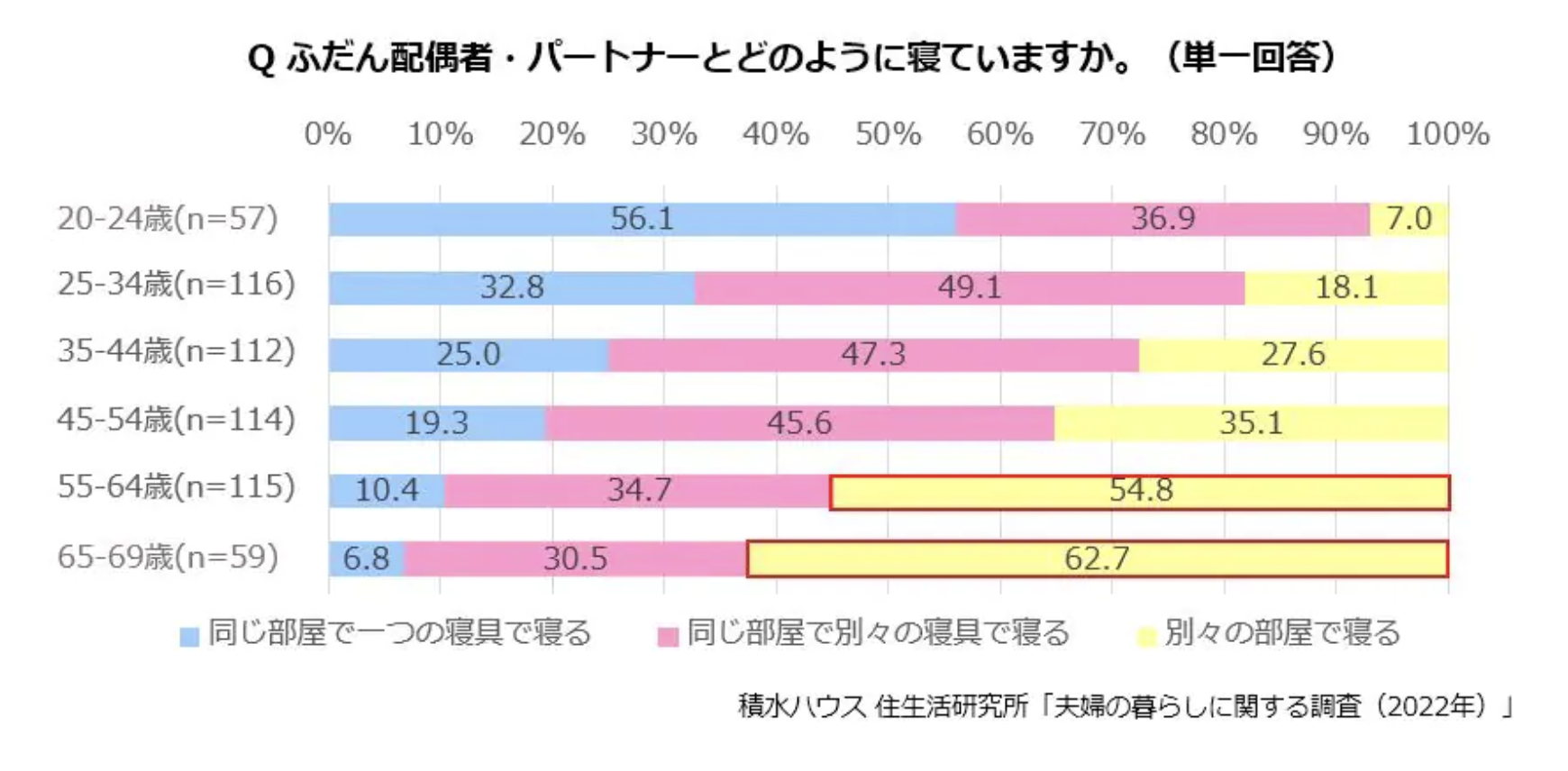 「積水ハウス 住生活研究所」が行った「夫婦の暮らしに関する調査(2022年)」によると、年代によって差はありますが、年を重ねるごとに別室で寝る夫婦が増えています。
