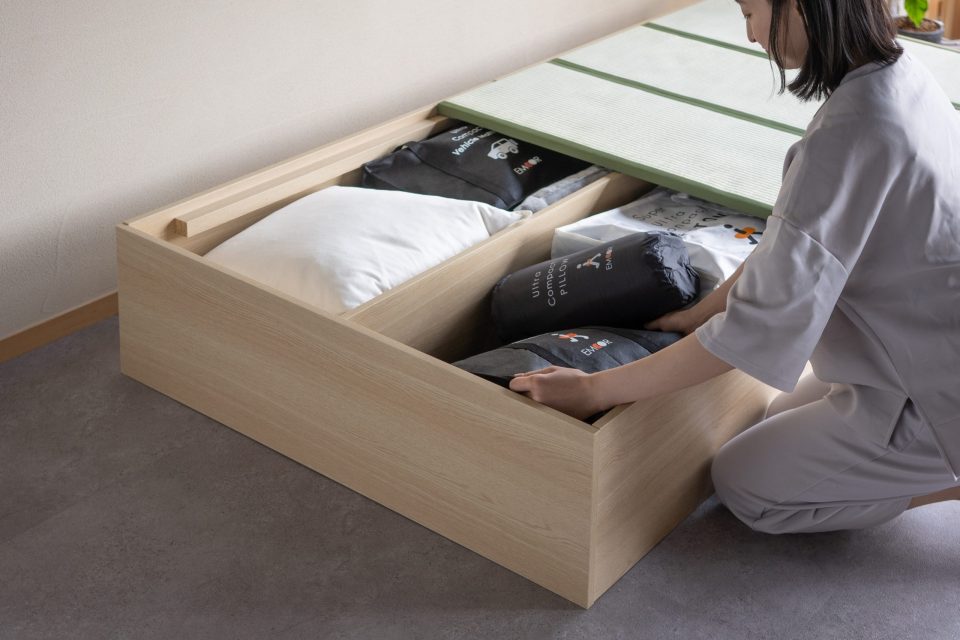 取り出しのしやすい引き出しタイプには、衣類や寝具の替えなど、