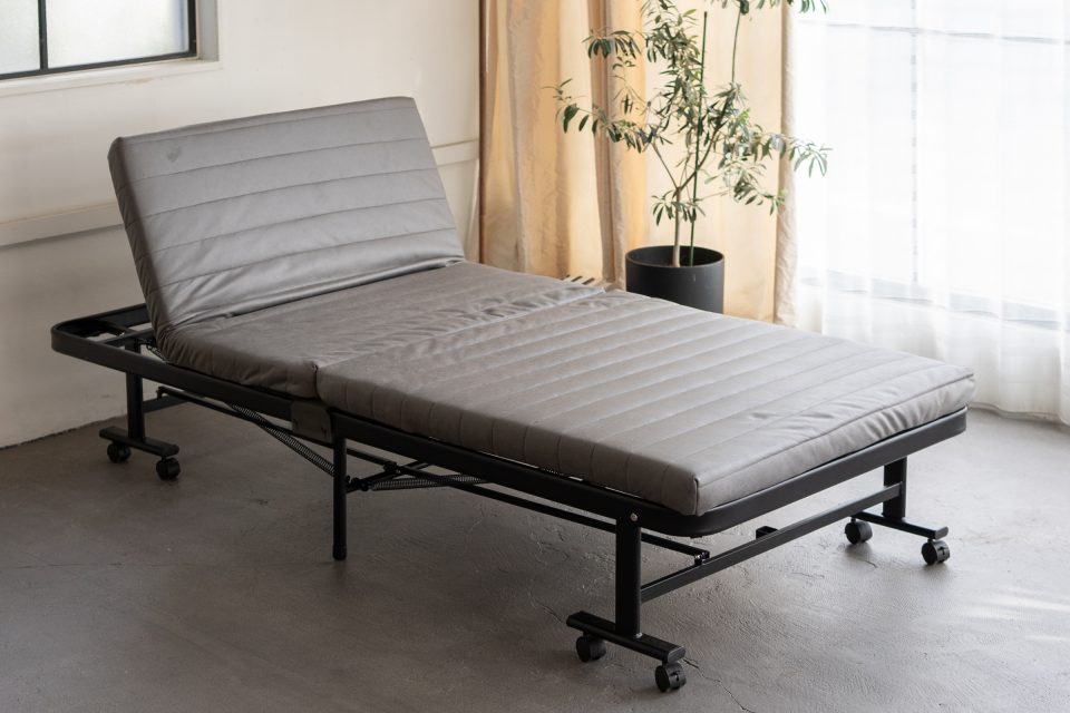 折りたたみ型 | 折り目が付いているマットレス 折りたたんだときに自立するよう、折り目に合わせて脚を配置(計8本) |