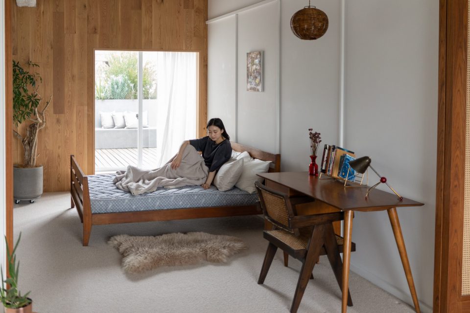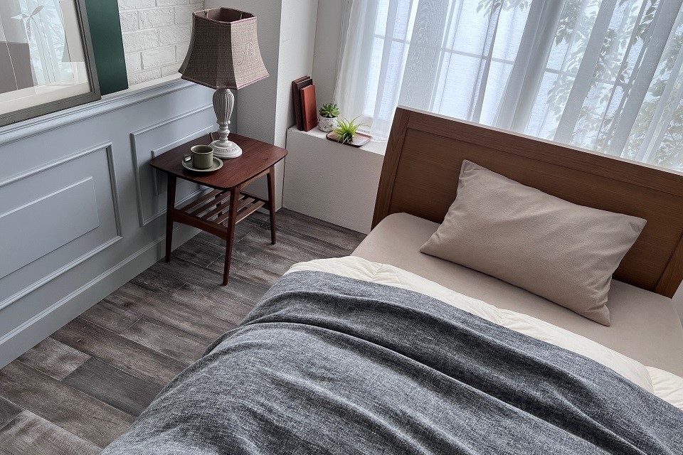 マットレスは基本的にベッドの上に置きますが、床への直置きも可能で、夫婦の寝室から1人暮らしの部屋まで幅広いシーンで活用できます。 こちらは夫婦の寝室にシングルマットレスを2つ並べたレイアウトです。ベッドと違って高さがないため、ナイトテーブルを置く必要はありません。置く家具が減った分、ベッドのレイアウトよりも部屋が広く見えるでしょう。 なお、マットレスの直置きはカビ対策が必須です。すのこやアルミシートの上に置いて湿気を逃がす、床に置ける設計のマットレスを選ぶといった工夫をすると快適に使用できます。マットレスのカビ対策について、詳しくは以下の記事をご覧ください。シングル和布団×2