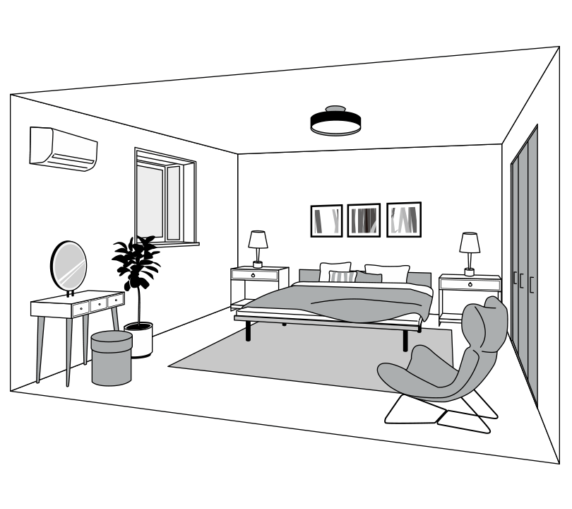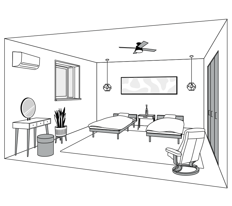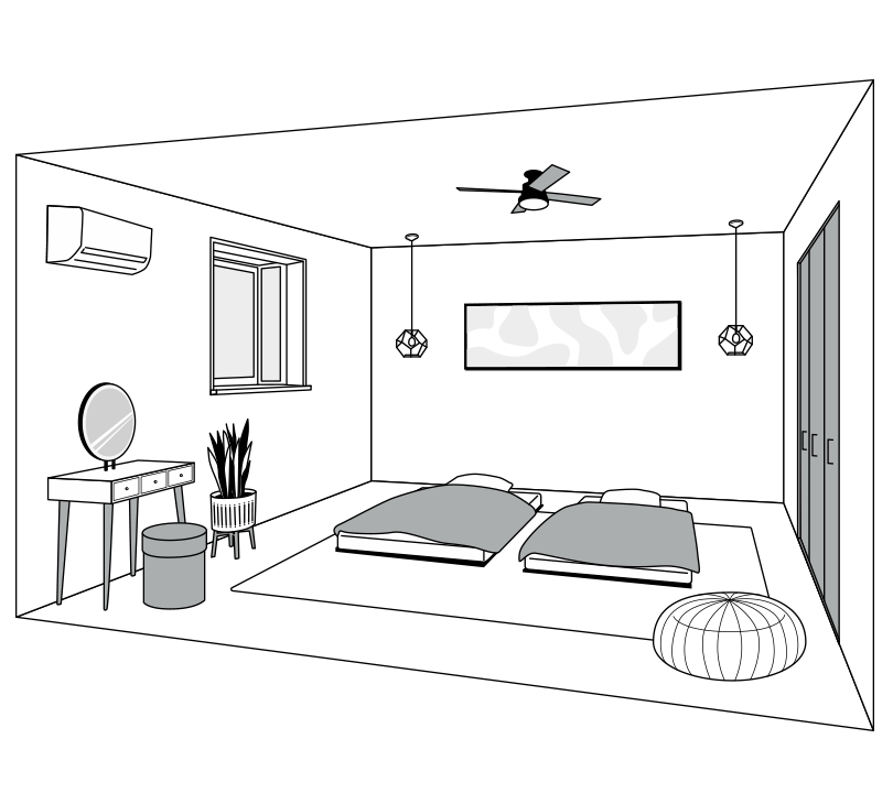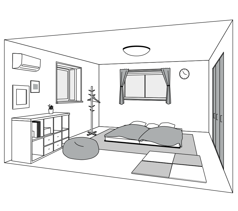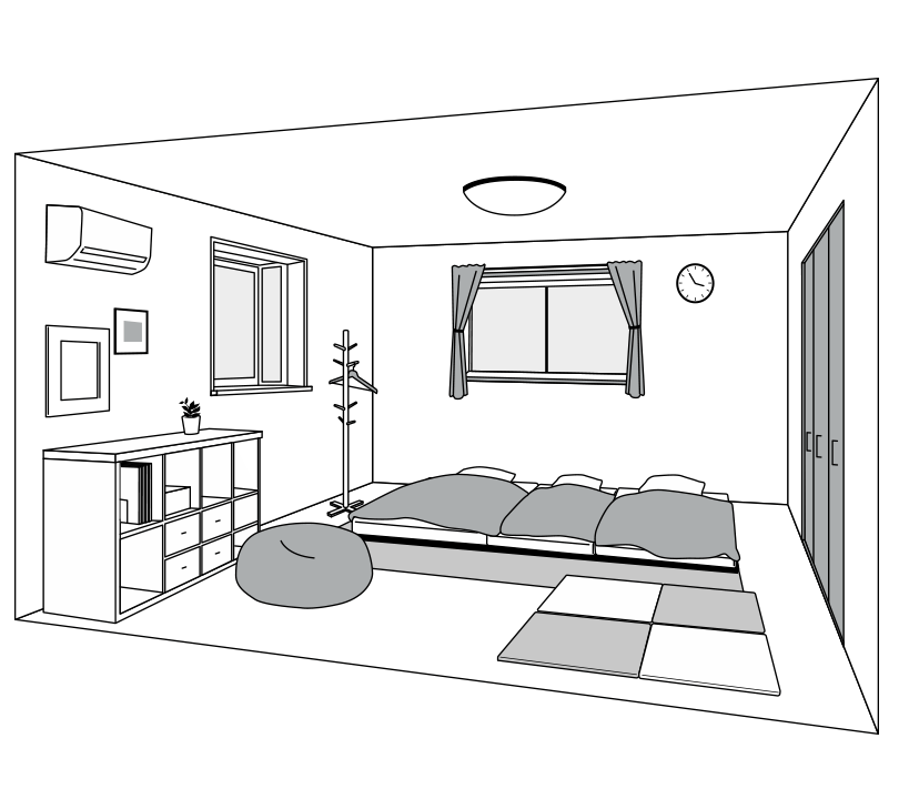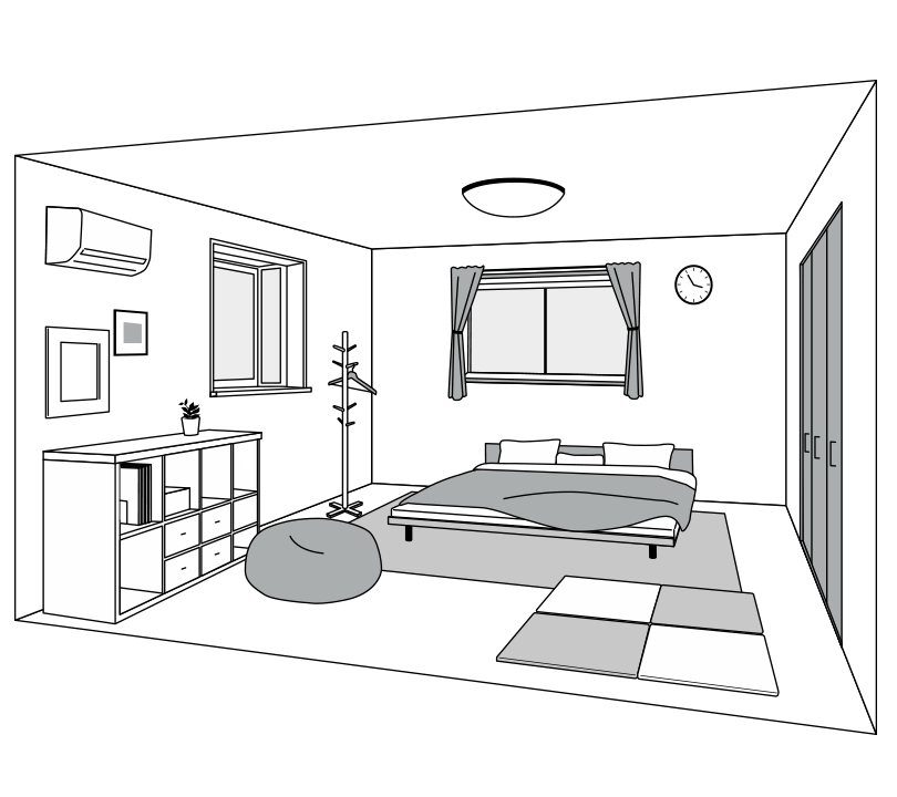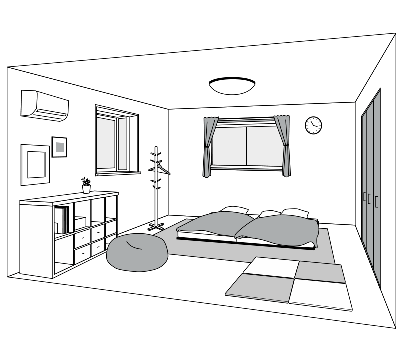 夫婦と子どもが同じ部屋で眠る場合は、手前で紹介したように1台のベッドを使うか、複数のベッド・マットレスを並べて置く方法があります。 今回は10畳の夫婦と子どもの寝室を想定して、クイーンサイズのベッドを1台置くレイアウトと、複数のマットレスを並べるレイアウトを紹介します。クイーンベッド1台