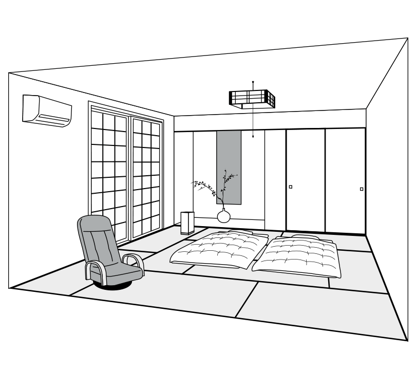 続いてはシングルサイズの和布団を並べたレイアウトです。ベッドやマットレス同様、布団を中心に他の家具を配置しています。 10畳の部屋であれば和布団を2つ置いても4畳分のスペースが空くため、こちらのレイアウトのようにチェアを置いても動線に影響は与えません。入口から布団、そして押入れまでの歩くスペースが確保されていることで快適に過ごせるでしょう。夫婦と子どもの寝室|10畳の部屋×ベッド・マットレスのレイアウト