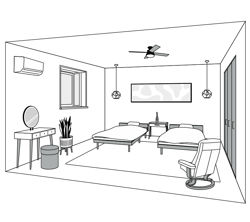 家具の配置はダブルと同じで、ベッドサイズをクイーンにしたレイアウトです。ナイトテーブルとの間隔が狭くなっていますが、手前の空間が広々としているため、窮屈さを感じさせません。 10畳という広さを活かし、チェアを置いてくつろぎスペースを設けました。チェアで読書をしたり、化粧台のスツールやベッドに腰かけたパートナーと会話をしたり、寝る前の時間をゆったりと過ごせそうです。シングルベッド2台