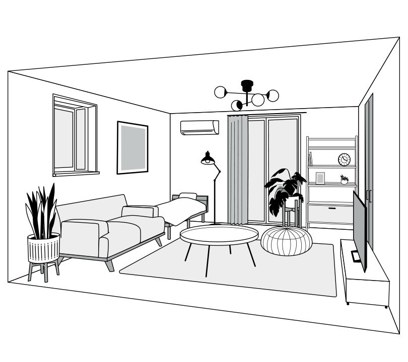 まず紹介するのは1人暮らしの10畳の部屋にシングルベッドを置いたレイアウト。ベッドの近くには高さのある照明器具とソファを配置して高低のバランスを取りました。正面から見て左側に高さのある家具を置き、右側に余白を出すと部屋を広く見せられます。シングルマットレス