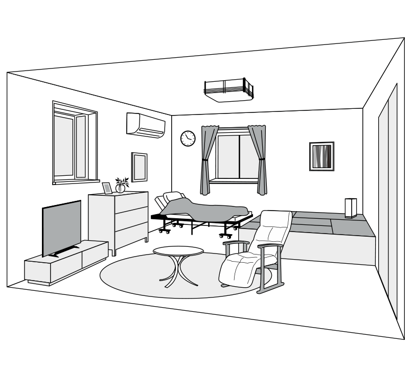 高齢者が1人で暮らす10畳の部屋向けとして、リクライニングベッドを置くレイアウトを提案します。ベッドだけではなく、部屋全体の快適性を考えました。シングルベッド