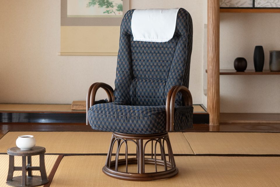 エムールでは多数の高座椅子を取り扱っていますが、お客様から長年支持いただいているものから、新たな機能や性質を取り入れているものもあります。 ここでは、エムールが手掛ける最新の高座椅子をご紹介します。ラタン肘掛け付き回転高座椅子「ゆるり」