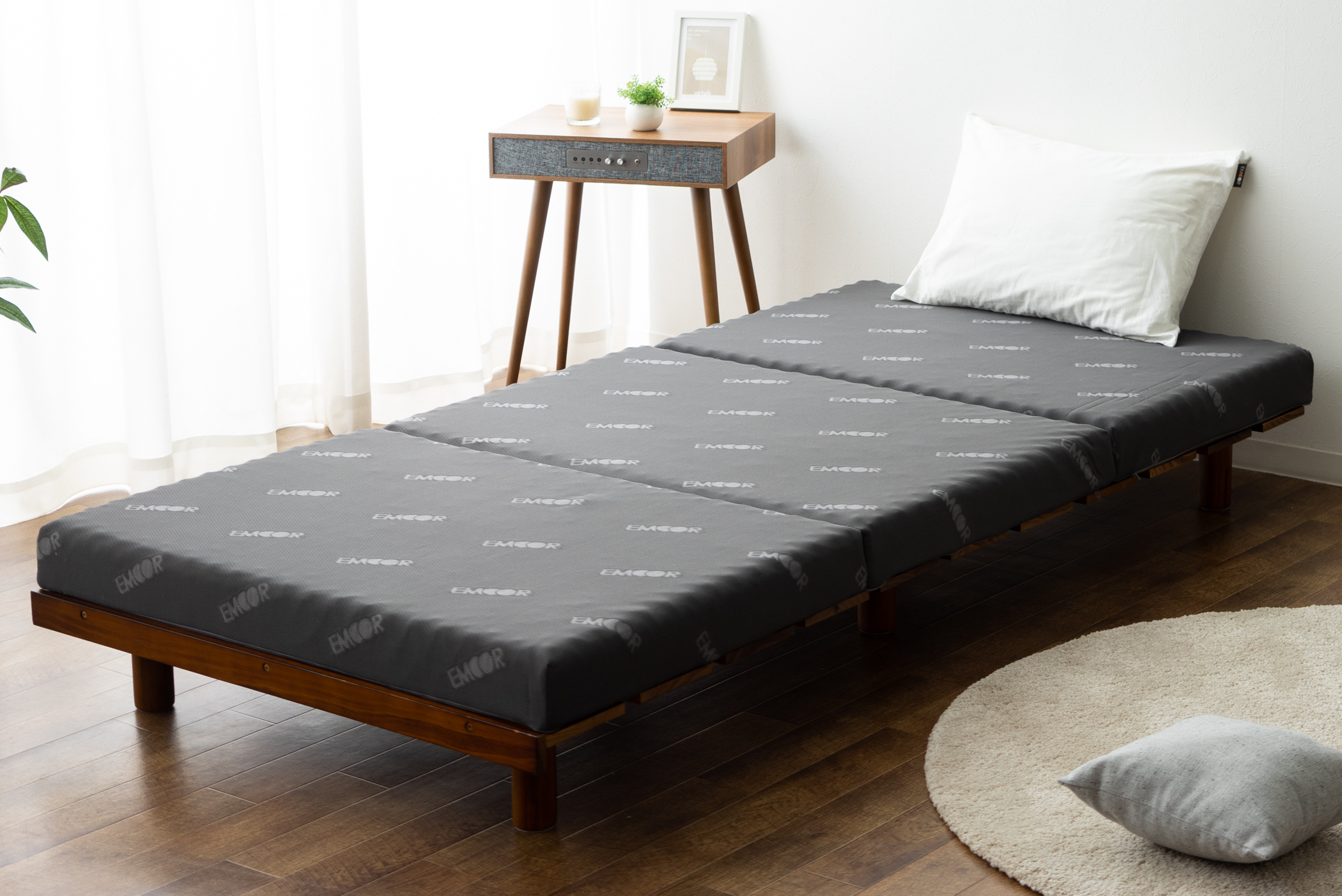 <良いものを、リーズナブルに> まだ高機能マットレスを使ったことがない方にも快眠の気持ちよさを知っていただきたいという開発者の熱意により、お手頃価格の高機能マットレスをご用意。 約8cmもの厚みにより、ベッドフレームでも床に直接敷いても使うことができる万能マットレスです。 限られたスペースを快適に使いたい、清潔に使いたいというニーズにもしっかりお応え。 三つ折りにできるため急な来客時でもサッと寝床を提供できます。