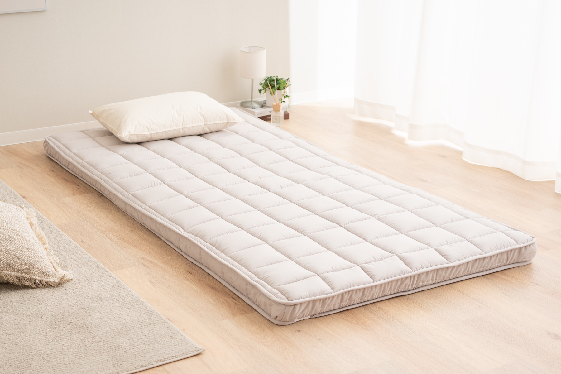 マットレスと敷布団の違いは、厚みや素材です。マットレスは厚みのあるものが多く、コイルやウレタンなどの素材でできています。敷布団は主に綿やポリエステルなどの素材が主で、マットレス程の厚みがないものがほとんどです。 マットレスは厚みがありクッション性が高いため、寝心地が良く快適に眠れます。腰痛や起床時に身体の痛みを感じる人におすすめです。敷布団は薄い分軽く、持ち運びが簡単。折りたたむこともできるので、収納場所にも困りません。また干したり、洗ったりなどのお手入れが比較的楽なのも特徴です。 寝心地を重視するならマットレスを、収納やお手入れを楽にしたいなら敷布団を選ぶと良いでしょう。 マットレスのクッション性と布団のコンパクトさを兼ね揃えた折りたたみマットレスについては後述します。マットレスのメリット