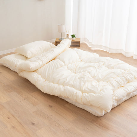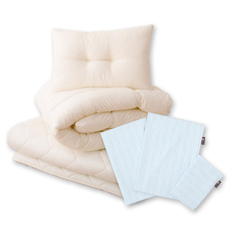 大きくは、枕・敷き布団・掛け布団の3点セットとカバー付きの6点セットがございます。 セット内容として最も一般的なのは、まくら・敷き布団・掛け布団の3点がセットになったものです。これだけでも眠れますが、敷き布団は洗えない場合が多いため、衛生面を考えて、枕カバー・敷き布団カバー・掛け布団カバーといった布団カバーもセットになった「6点セット」を選ぶと良いでしょう。