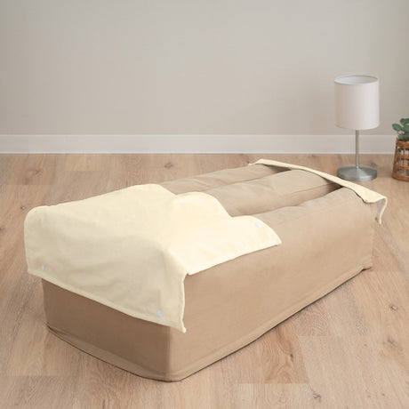 中央に腹部を支えるクッションを設け、四肢を左右から包む設計で、寝たきりでも安定した姿勢を保ちやすくします。