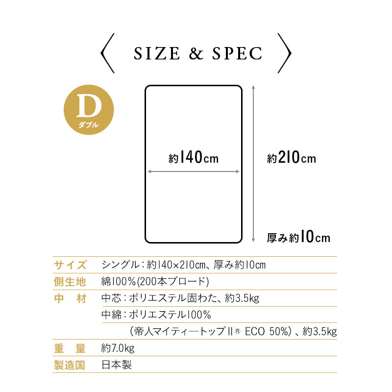 厚さ約10cmの極厚三層構造で、ふかふかで床付き感がなく質の高い睡眠をサポートします。