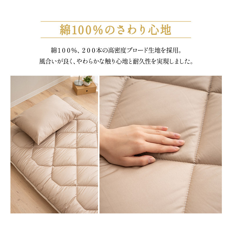 | 組成 | 生地:綿100%(200本ブロード) 中芯:ポリエステル固わた 2.5kg 中わた:ポリエステル100% (帝人マイティ―トップⅡ®ECO 50%使用) 2.5kg |
