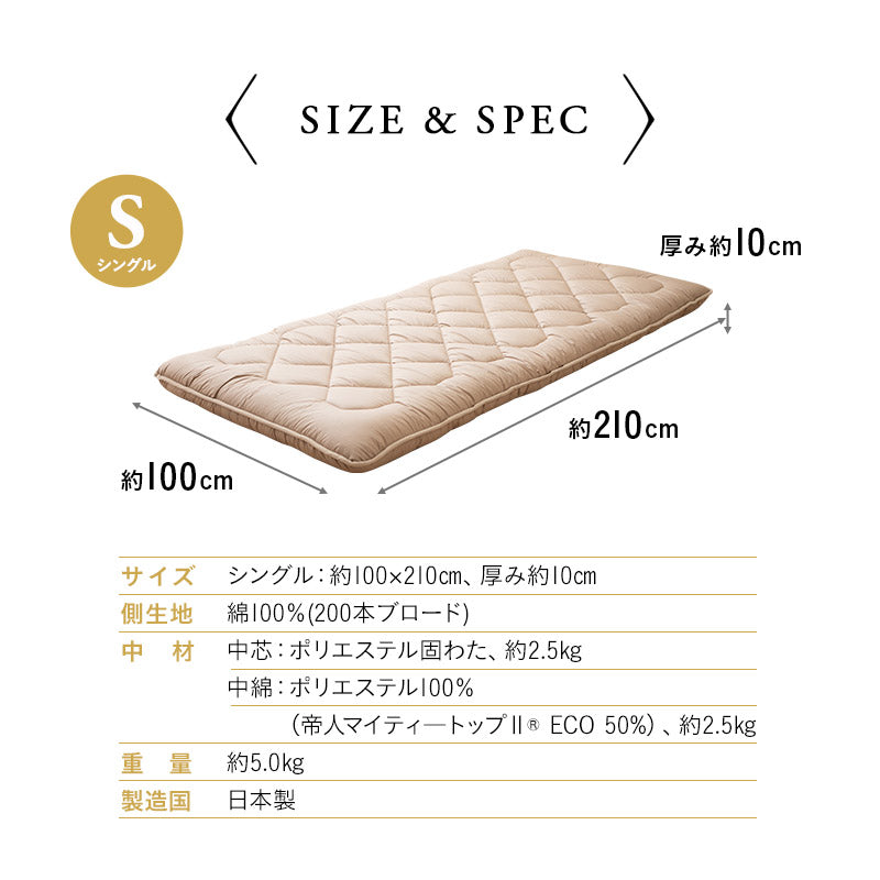 | サイズ | シングルサイズ:約100×210cm 厚さ:約10cm |
