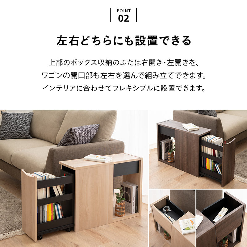 上部BOX扉やワゴン開口部は左右どちらでも設置でき、置く場所や使い方の自由度が高いです。