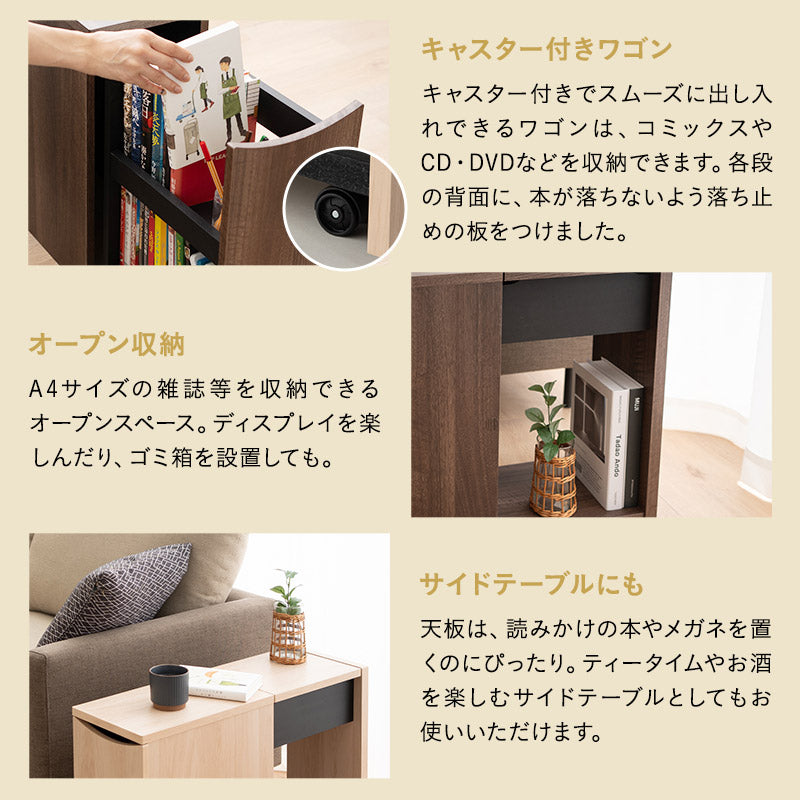 キャスター付きワゴンは出し入れが簡単で、背面には落ち止め板が付いて収納物の落下を防ぎます。