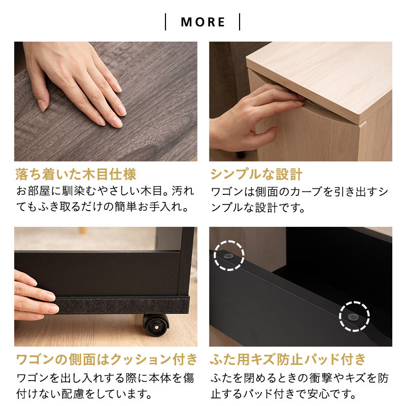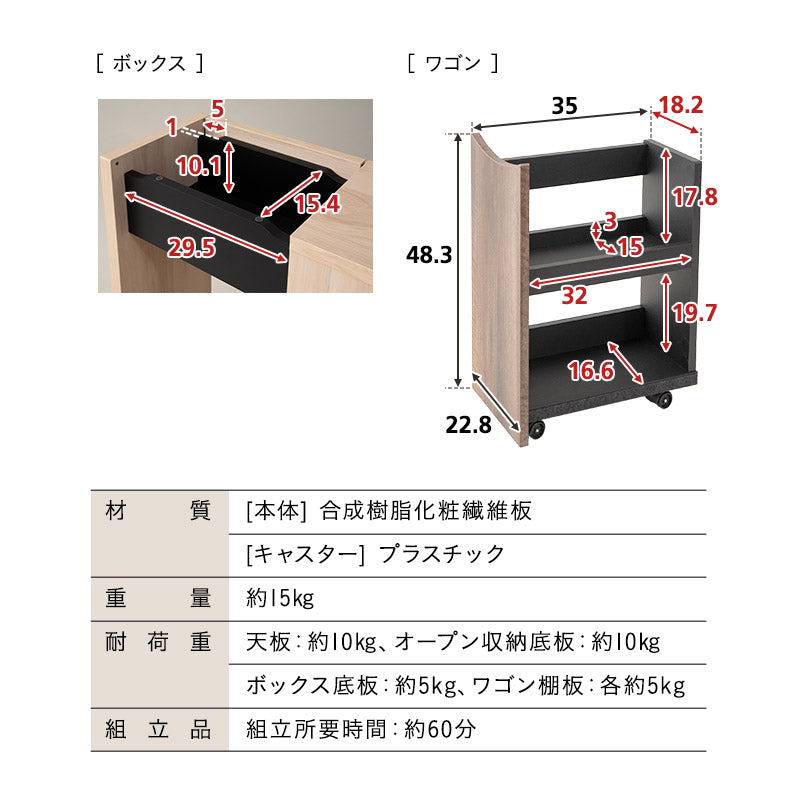 耐荷重 | 天板:約10kg オープン収納底板:約10kg ボックス底板:約5kg ワゴン棚板:各約5kg |