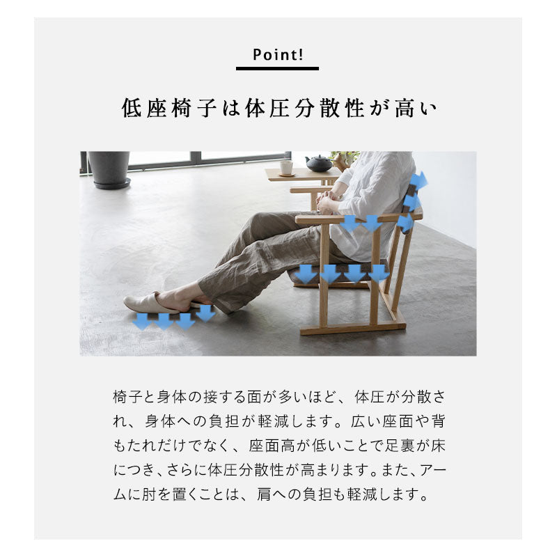 座面高約26cmで足を伸ばしてくつろげる低座椅子は、お尻が痛くならず立ち上がりも楽にできます。