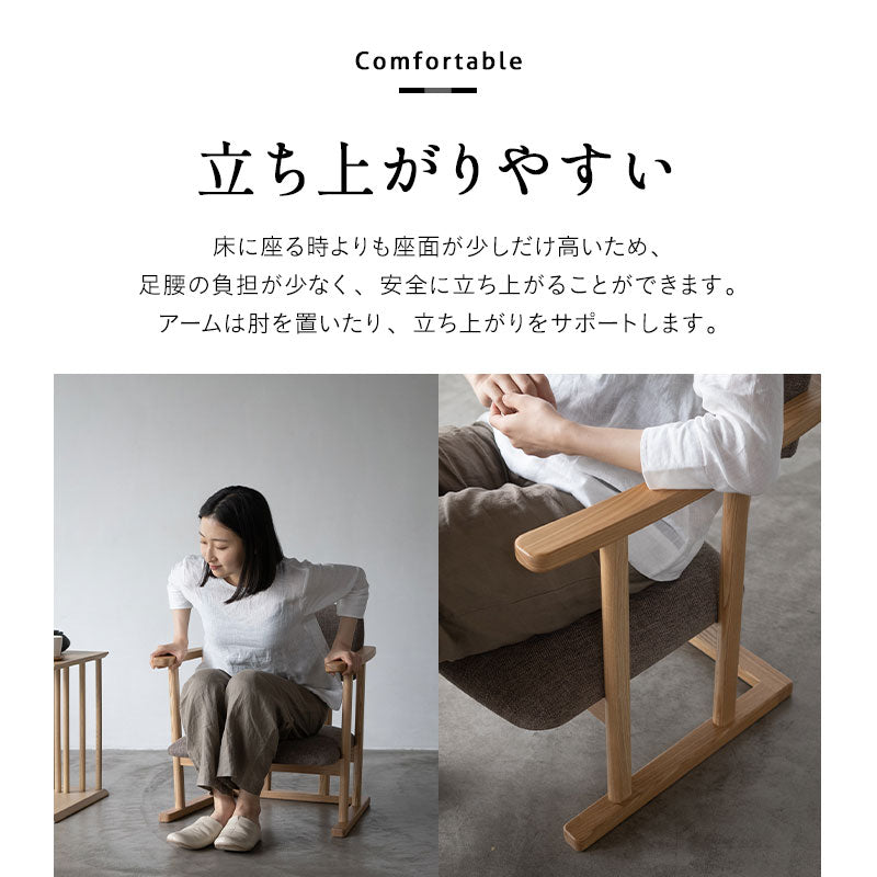 座面の高さにより足腰の負担が軽減され、アーム付きで肘を置けるため安全に立ち上がれます。