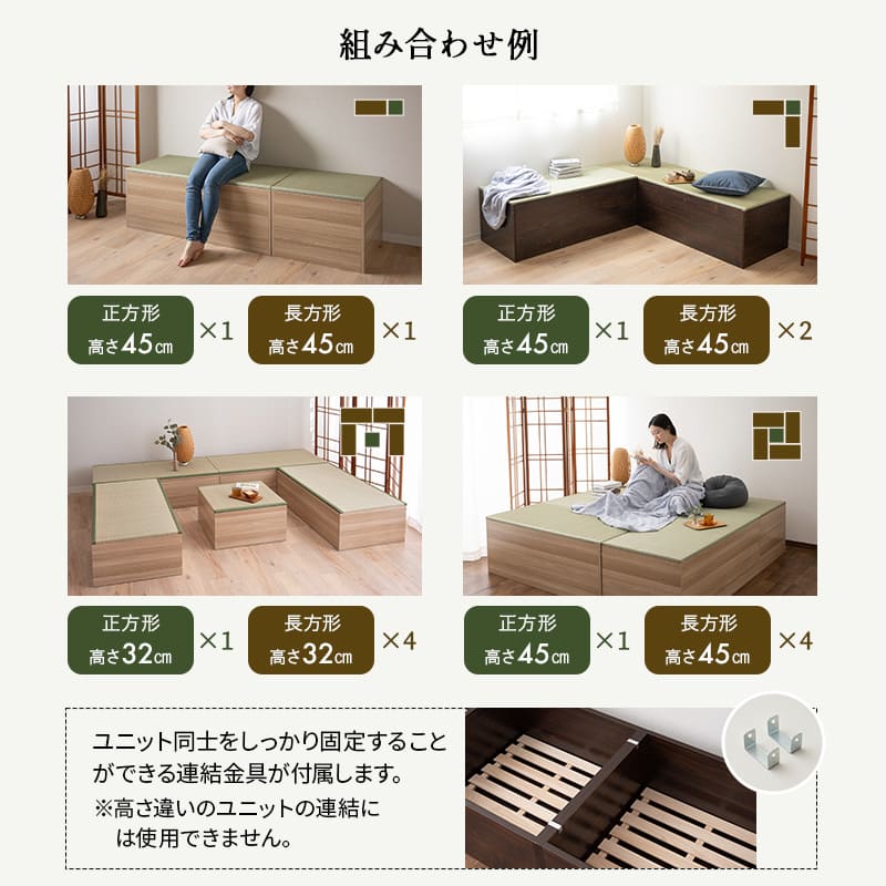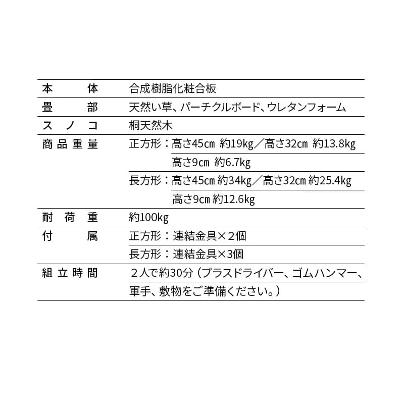 商品重量 | <正方形> 高さ9cm:約6.7kg 高さ32cm:約13.8kg 高さ45cm:約19kg <長方形> 高さ9cm:約12.6kg 高さ32cm:約25.4kg 高さ45cm:約34kg |