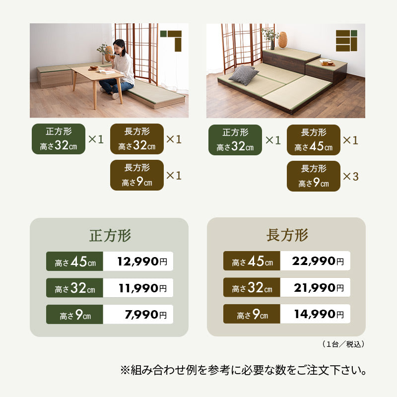 | 商品重量 | <正方形> 高さ9cm:約6.7kg 高さ32cm:約13.8kg 高さ45cm:約19kg <長方形> 高さ9cm:約12.6kg 高さ32cm:約25.4kg 高さ45cm:約34kg |