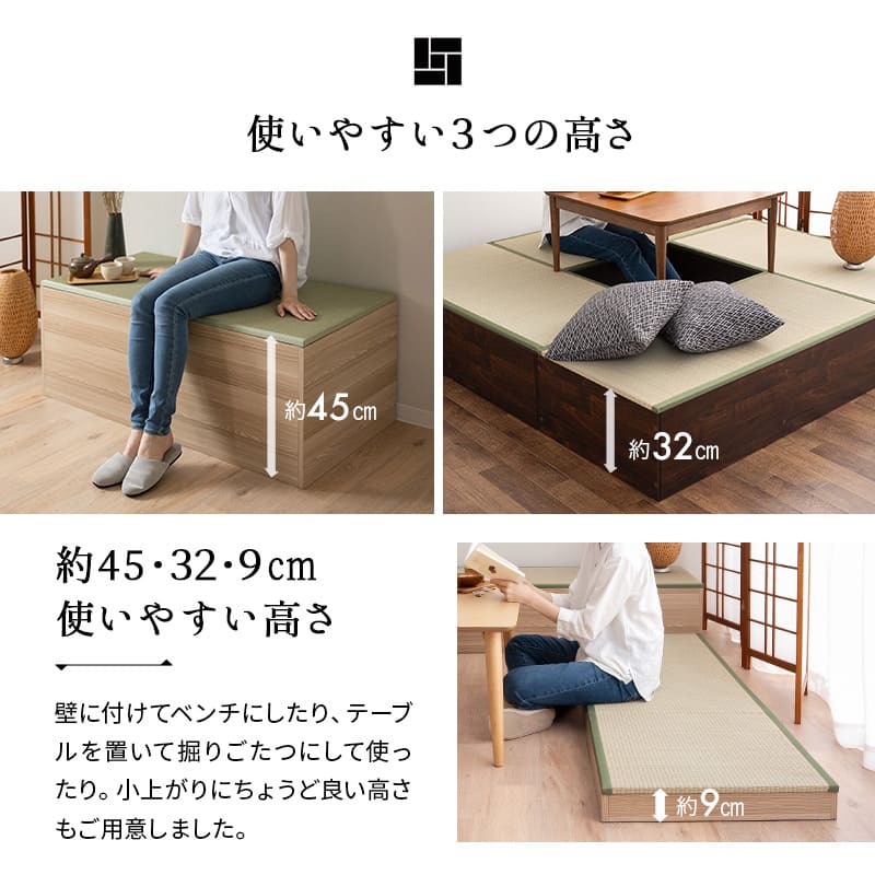 選べる高さや滑り止め、ストッパー付き畳面など細部の工夫で、店舗や家庭の様々な用途に対応します。