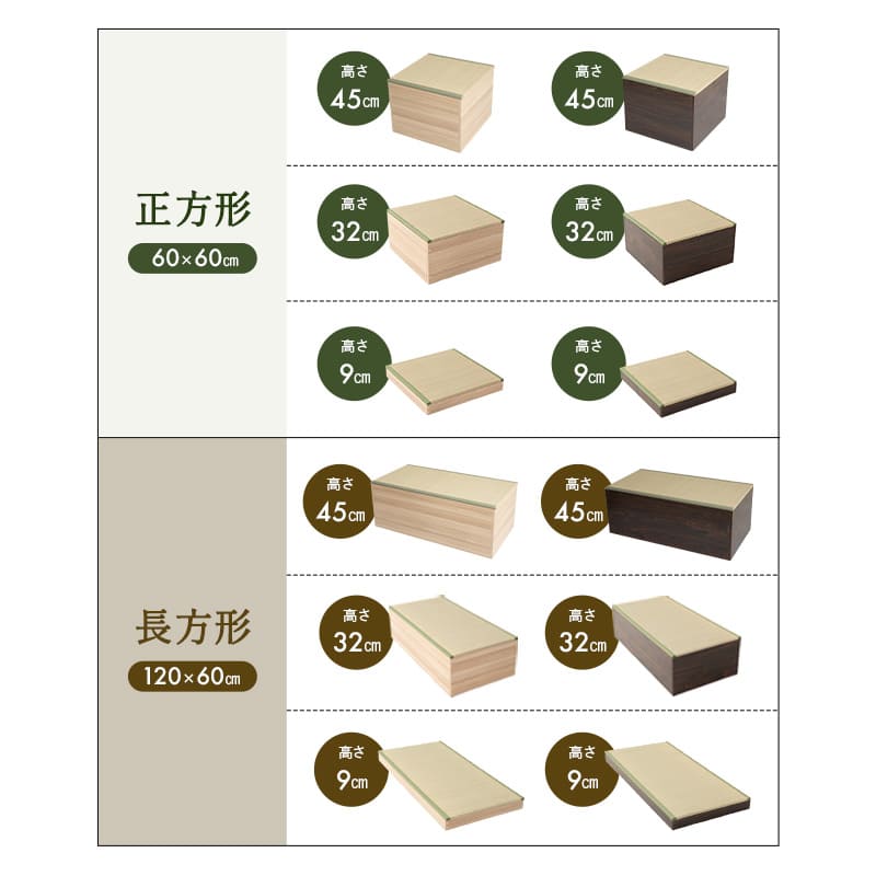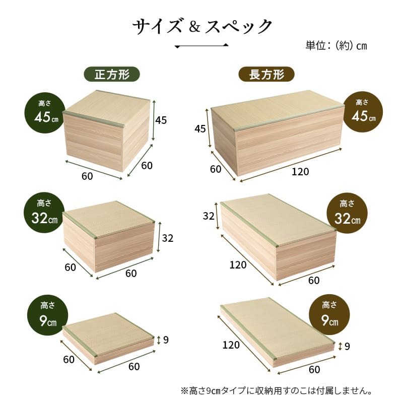 サイズ | <正方形> 約幅60×奥行60×高さ9/32/45cm <長方形> 約幅120×奥行60×高さ9/32/45cm |