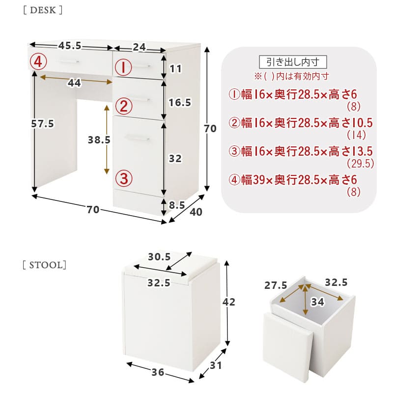 サイズ | 全体:約幅70×奥行40×高さ117cm デスク:約幅70×奥行40×高さ70cm スツール:約幅36×奥行31×高さ42cm スツール内寸:約幅32.5×奥行27.5×高さ34cm ミラー:約幅58×奥行5×高さ45cm (台座を取り付けた場合:約幅58×奥行12×高さ47cm) |
