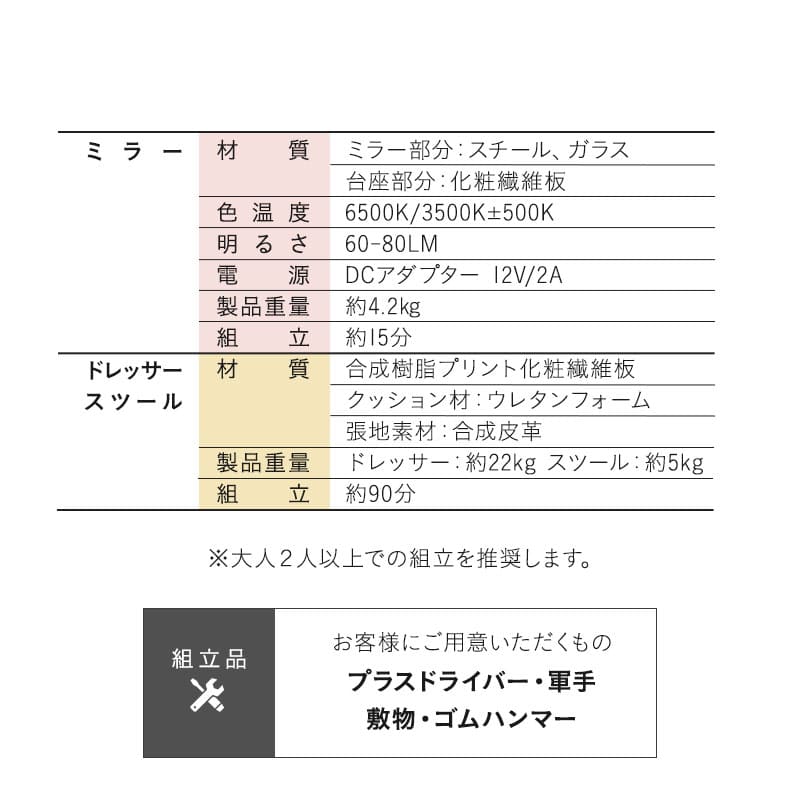 組立所要時間 | デスク:約90分 ミラー:約15分 ※ミラーと台座は、お客様取り付けとなります。 ※プラスドライバー・ゴムハンマーをご用意ください。 ※組立時、軍手・敷物があると便利です。 ※大人2人以上での組み立てを推奨しております。 |