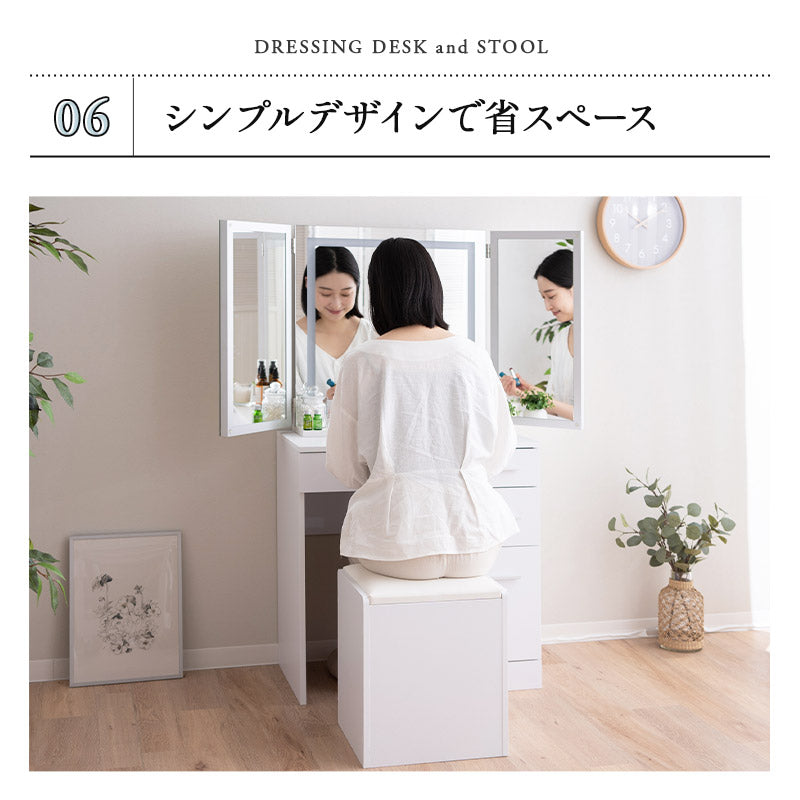 サイズ | 全体:約幅70×奥行40×高さ131.5cm デスク:約幅70×奥行40×高さ70cm スツール:約幅36×奥行31×高さ42cm スツール内寸:約幅32.5×奥行27.5×高さ34cm 三面鏡(閉じた状態):約幅60×奥行18×高さ61.5cm 三面鏡(開いた状態):約幅120×奥行18×高さ61.5cm |