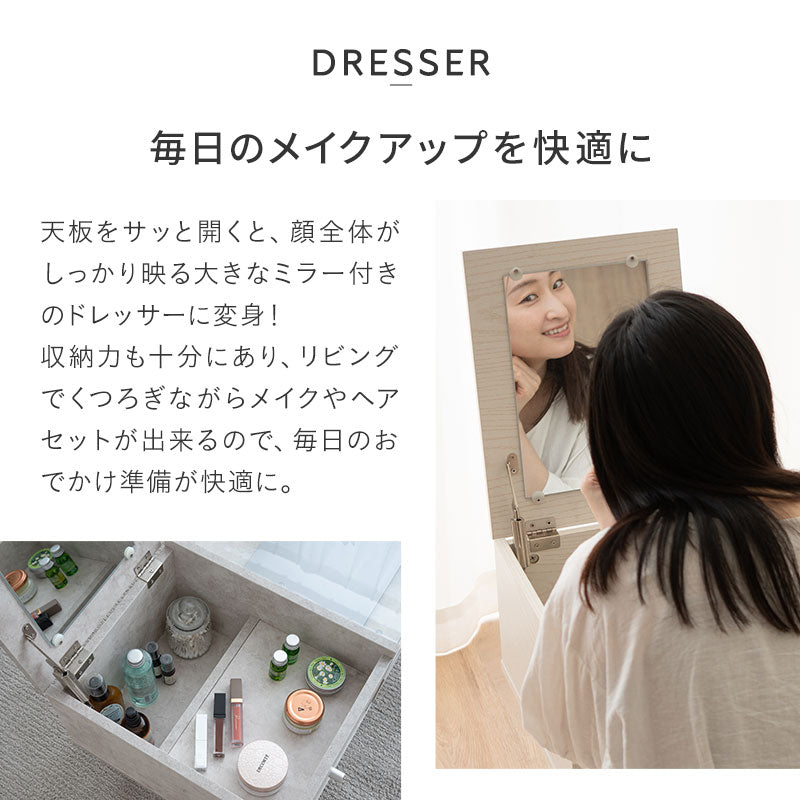 センターテーブルとドレッサーが一体化し、天板を開けば大きなミラーで身支度も快適に行えます。