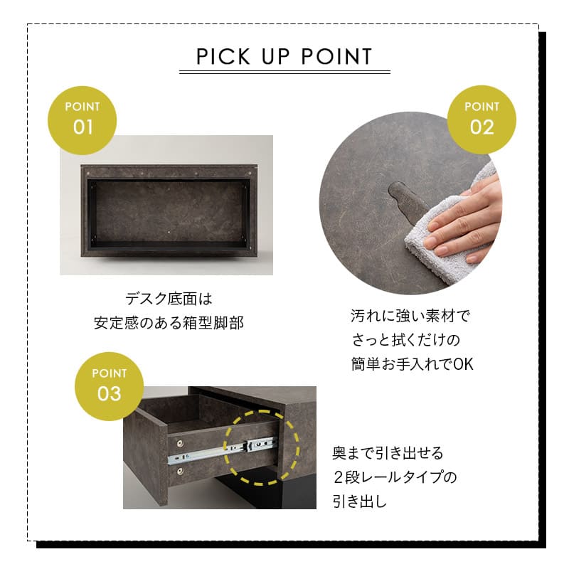 安定感のある脚部と、奥まで引き出せる2段レールで細部まで機能性を追求しています。