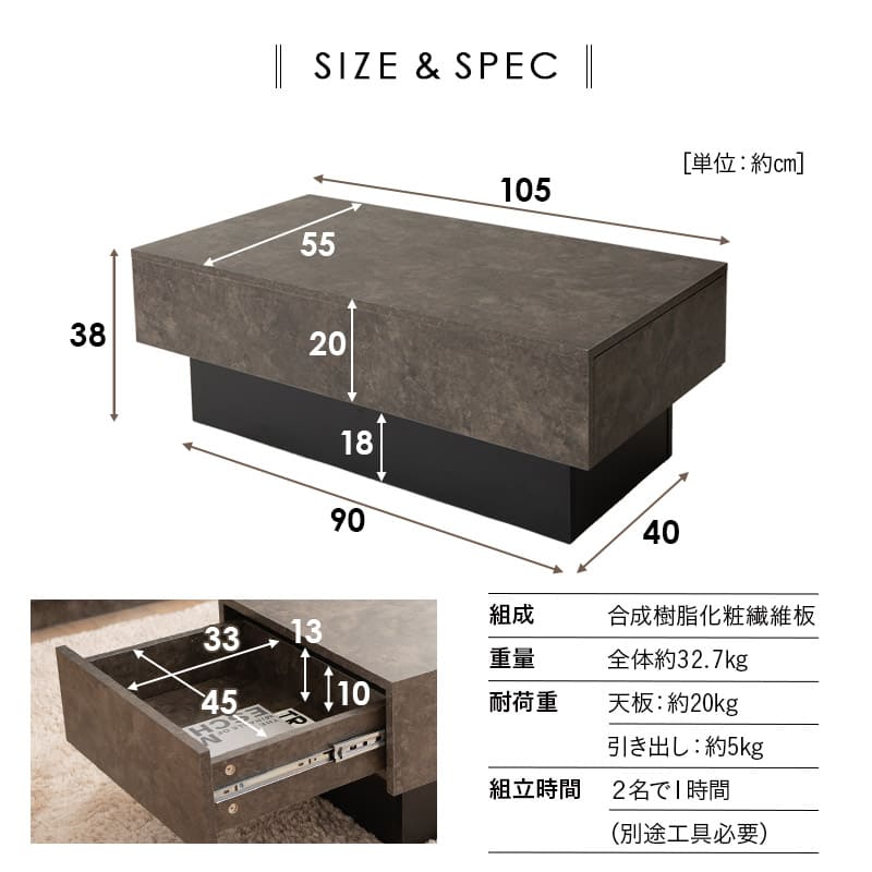 サイズ | 全体:約幅105×奥行55×高さ38cm 引き出し(内寸):約幅33×奥行45×高さ10cm |