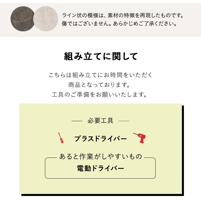 組立所要時間 | 大人2人で約60分 ※プラスドライバーをご用意ください。 ※電動ドライバー・敷物があると便利です。 |