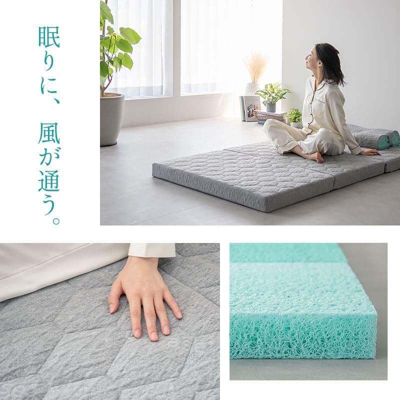 抗ウイルス加工の高機能ニットカバーと三つ折り収納で衛生的、省スペースに使える万能マットレスです。