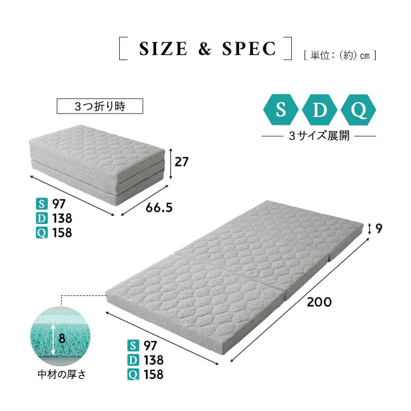 サイズ | ■シングル 約幅97×奥行200×厚さ9cm (折りたたみ時:約幅97×奥行66.5×厚さ27cm) ■ダブル 約幅138×奥行200×厚さ9cm (折りたたみ時:約幅138×奥行66.5×厚さ27cm) ■クイーン 約幅158×奥行200×厚さ9cm (折りたたみ時:約幅158×奥行66.5×厚さ27cm) |