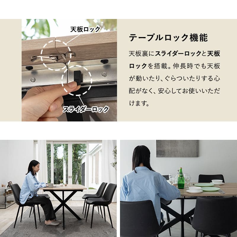 天板は約40cm伸長でき、4人から最大8人まで対応。日常使いから来客時まで、住まいの広さに左右されない快適な空間を実現します。