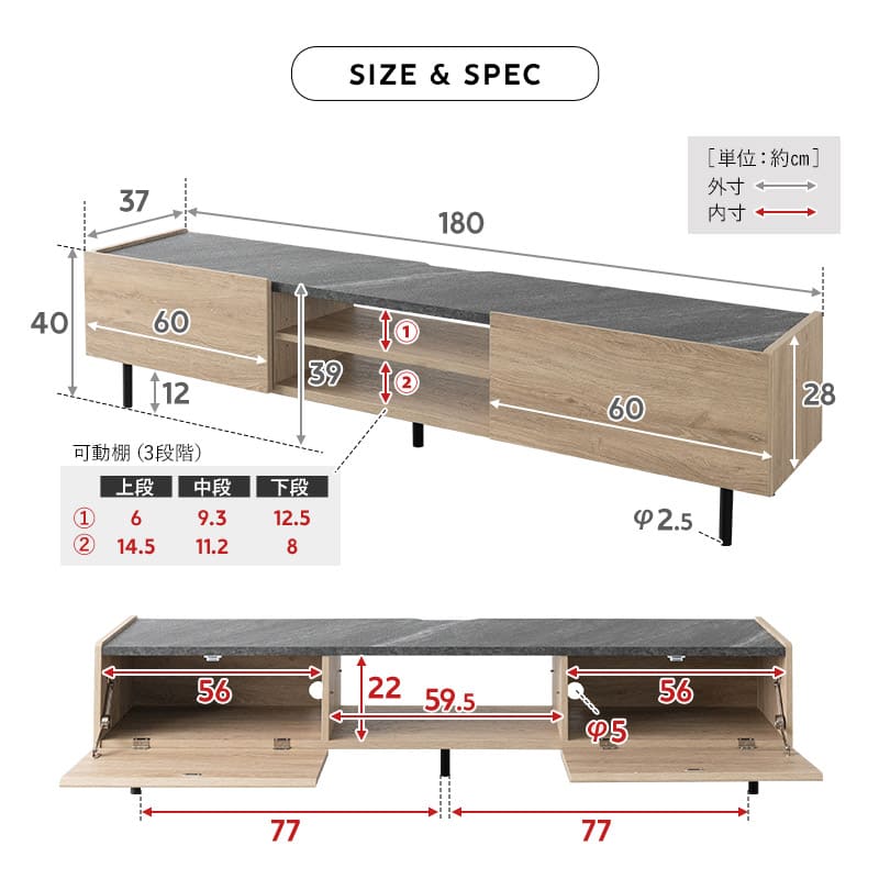 | サイズ | 全体:約幅180×奥行37×高さ40cm フラップ扉内収納部内寸(左右):約幅56×奥行37×高さ22cm 中央収納内寸:約幅59.5×奥行37×高さ22cm ※可動棚付き |