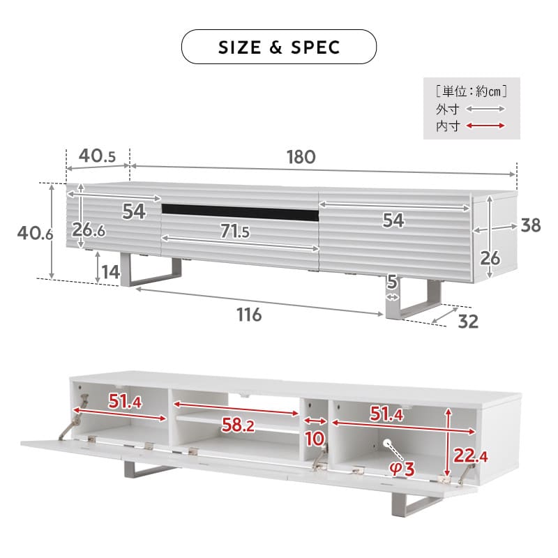 サイズ | 全体:約幅180×奥行40.5×高さ40.6cm フラップ扉内収納部内寸(左右):約幅51.4×奥行38×高さ22.4cm 中央収納部内寸:約幅58.2×奥行38×高さ22.4cm |