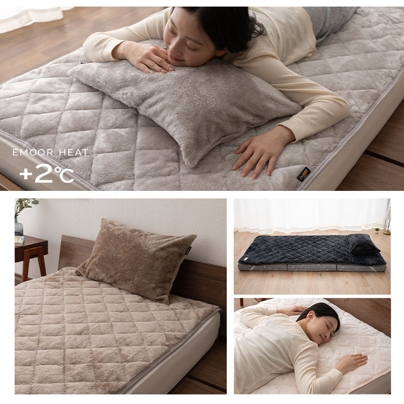 湿気や汗を吸収し発熱する特殊素材「エムールヒート」で、暖かさが持続します。なめらかで艶やかな肌触りが快適な眠りをサポートします。