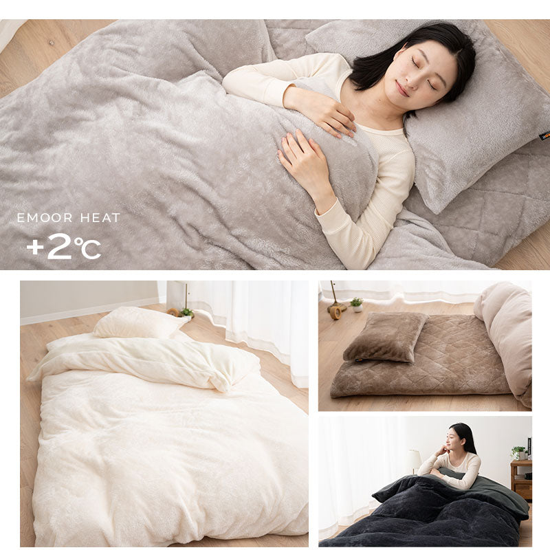 湿気や寝汗を吸収して発熱する「エムールヒート」素材が持続的な暖かさを実現します。