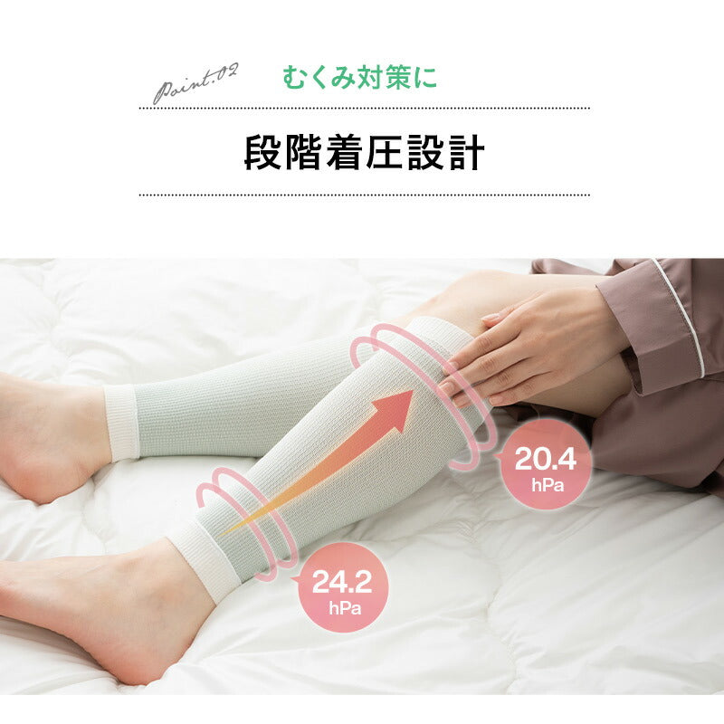脚のむくみや疲れに配慮し、ほどよい段階着圧設計でふくらはぎをサポートします。