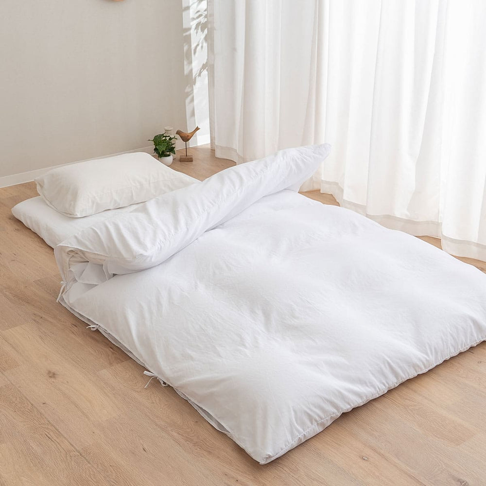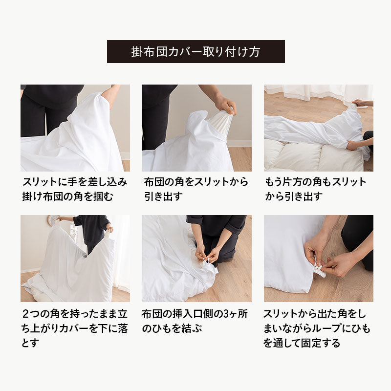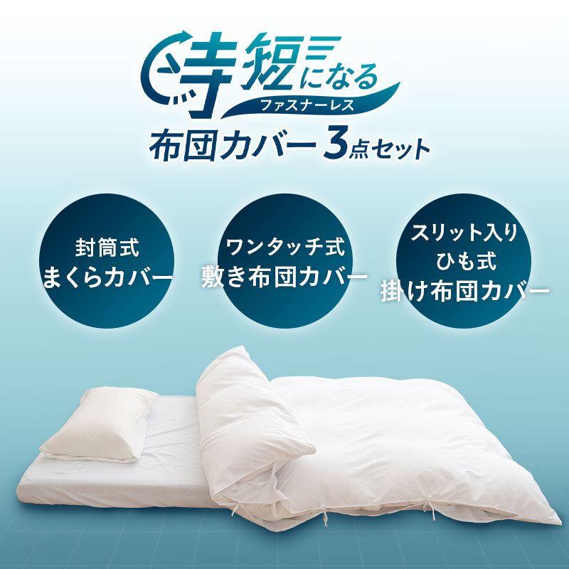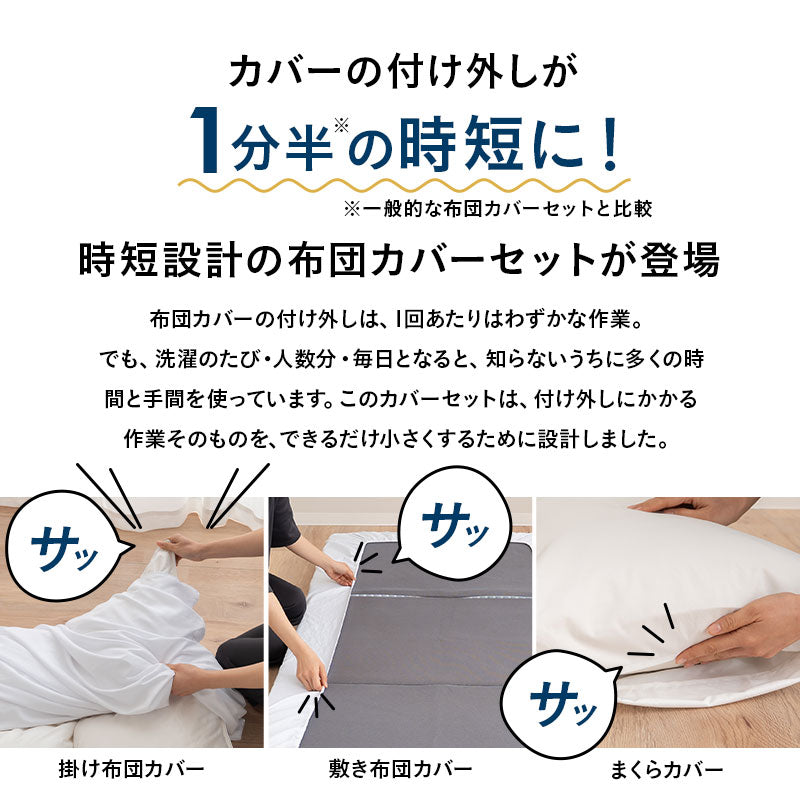 ファスナーを使わないことで、掛け布団カバー・敷き布団カバー・まくらカバーの付け外しが約1分半で完了します。