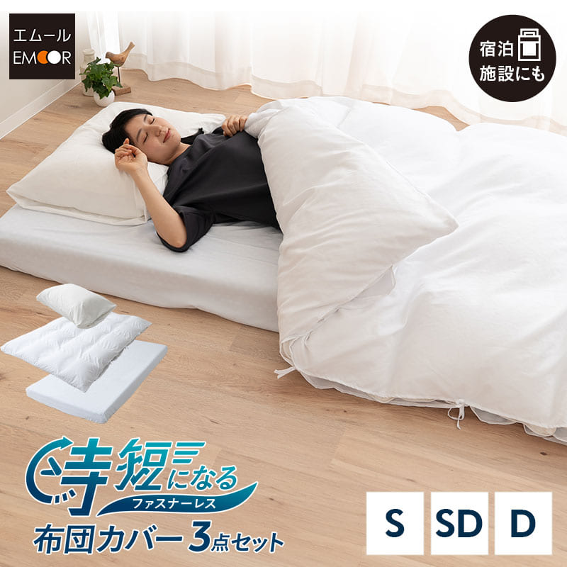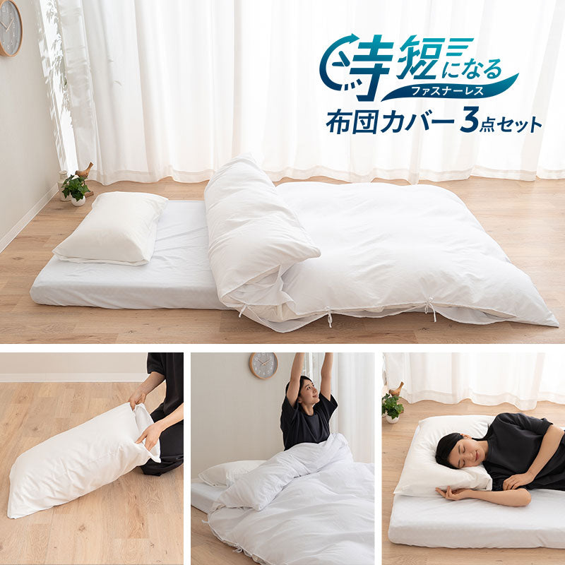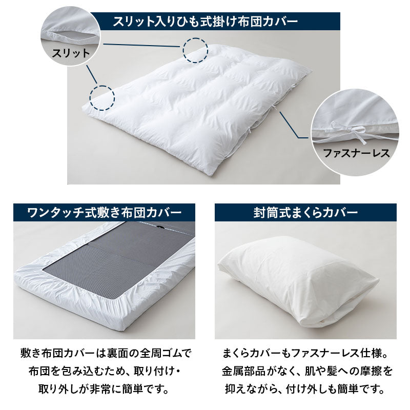 布団カバー3点全てがファスナーレス仕様の時短設計なので、毎日のメンテナンスがぐっと快適です。