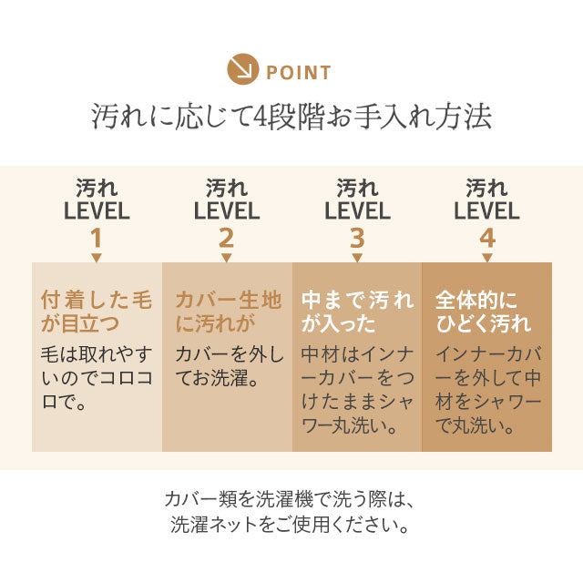 洗濯 | カバー:洗濯機洗い可能(※洗濯ネットをご使用ください。) 底材:シャワーで手軽に洗えます。 |