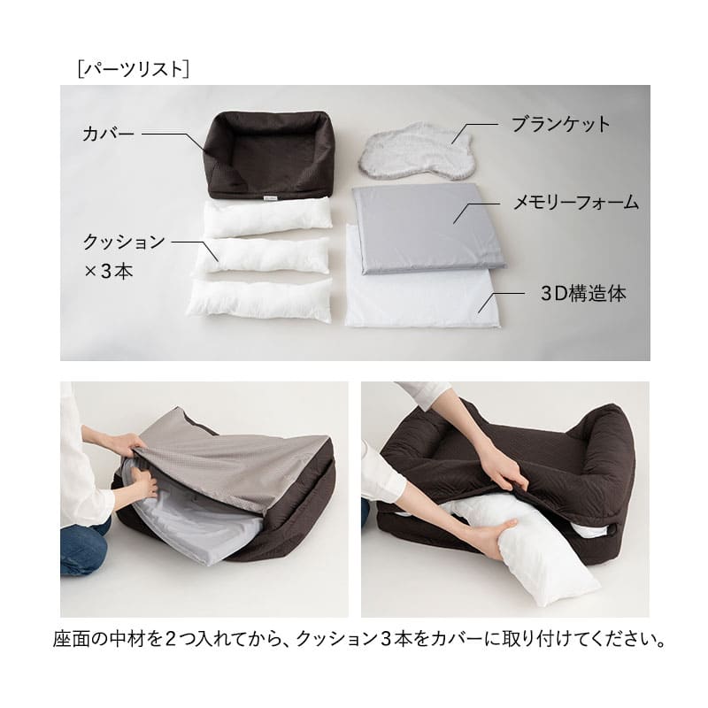 素材 | ■アウターカバー 表生地:ポリエステル100%(熱キルト生地 ツイルピーチスキン) 底生地:ポリエステル100%(滑り止め加工) ■中材 クッション:ポリプロピレン100% 3本 底面(メモリーフォーム):ウレタンフォーム 45D 底面(3D構造体):ポリエチレン100% 70D ■ブランケット 表生地:ポリエステル100%(フェイクファー) 裏生地:ポリエステル100%(スエード) |