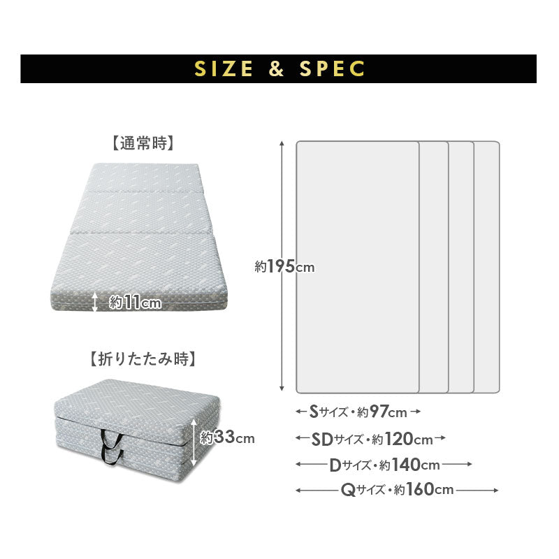 サイズ | セミシングルサイズ:約80×195×11cm (折りたたみ時:高さ約33cm) |