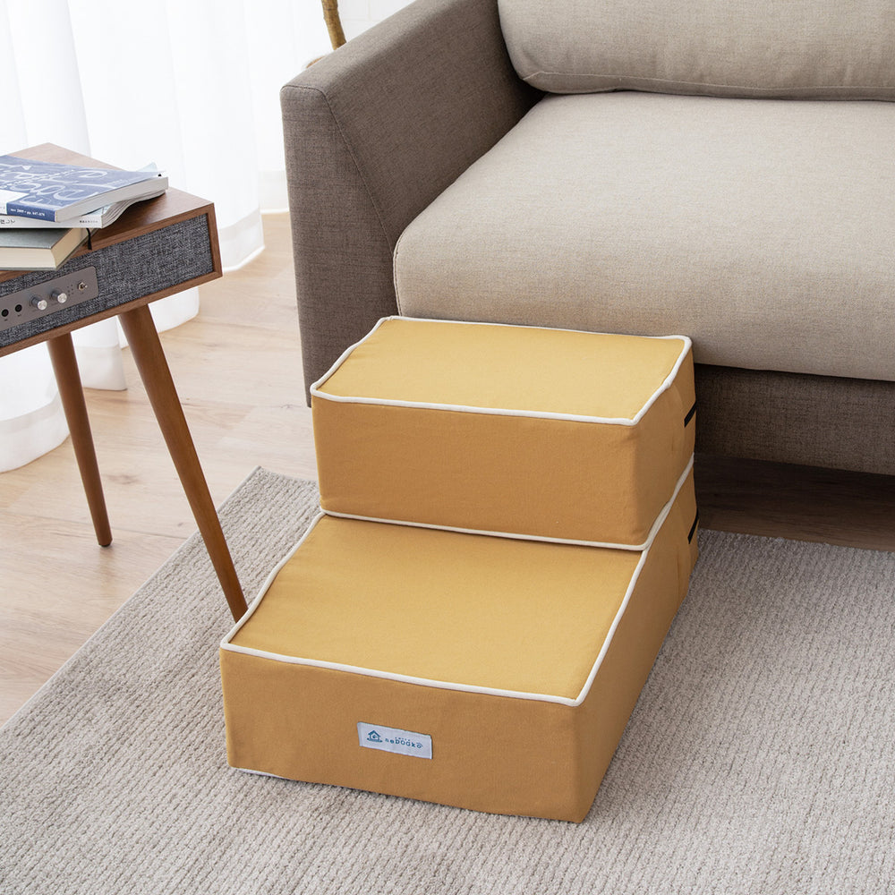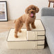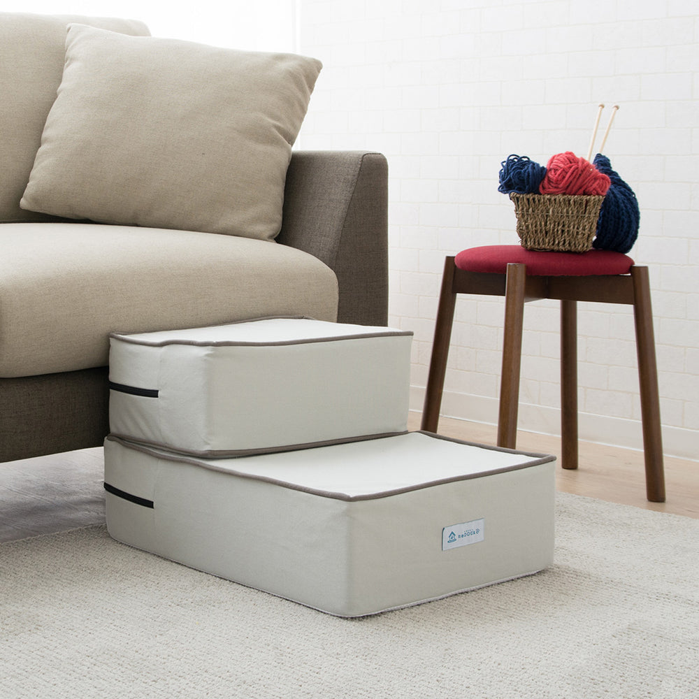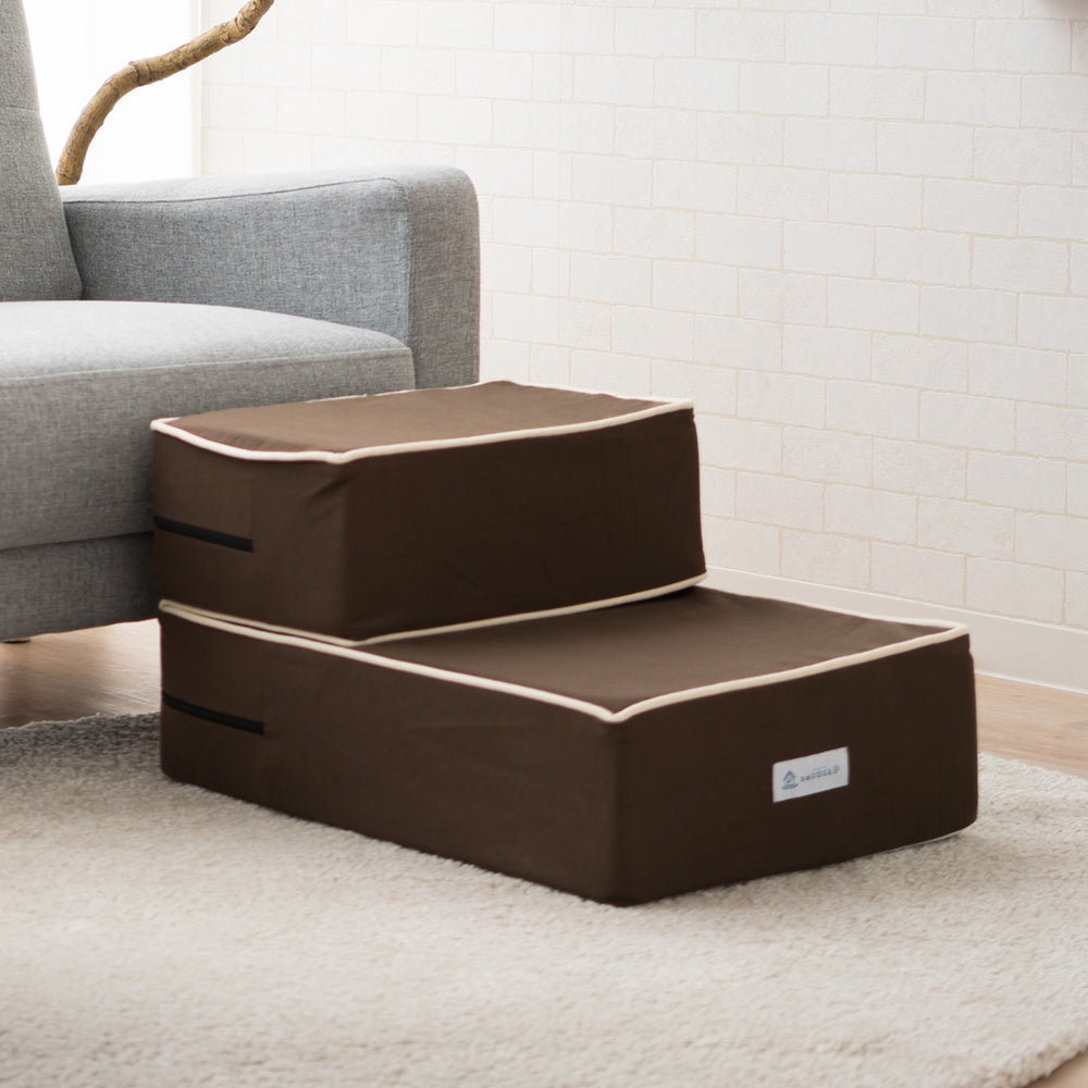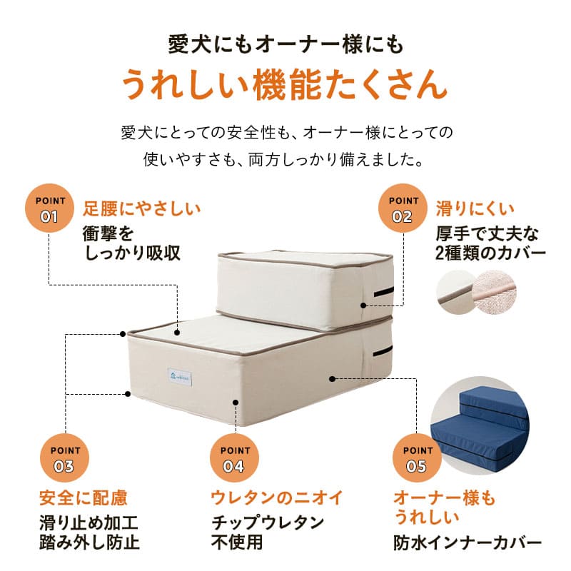 | 使い方のコツ | 自然にドッグステップを使ってもらうためのちょっとしたコツをご紹介します。 ①慣らし期間 存在や臭いに慣れてもらう期間です。 ※チップウレタンを使っていませんので、粘着剤のような刺激臭はありません。 ②だんだんと フラットタイプでまずは存在に慣れてもらいましょう。 最初はドッグフードやおもちゃを使って。 ③意識させない ソファやベッド越しにご家族を呼んでみましょう。 オーナー様の視線に意識を向けることで、ステップが気にならなくなっていきます。 |