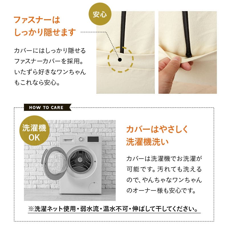 | 洗濯 | ■カバー 取り外して洗濯機洗い可能 (※洗濯ネット使用・弱水流・温水不可・伸ばして干すこと推奨) ■防水インナーカバー 汚れた部分を拭き取ってください。 |