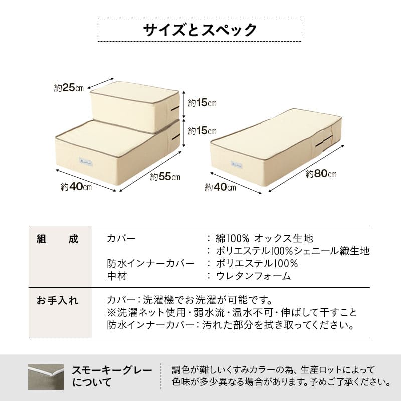 | 素材 | ベーシックカバー:綿100%(オックス生地) ラグジュアリーカバー:ポリエステル100%(シェニール織生地) 防水インナーカバー:ポリエステル100% 中材:ウレタンフォーム |