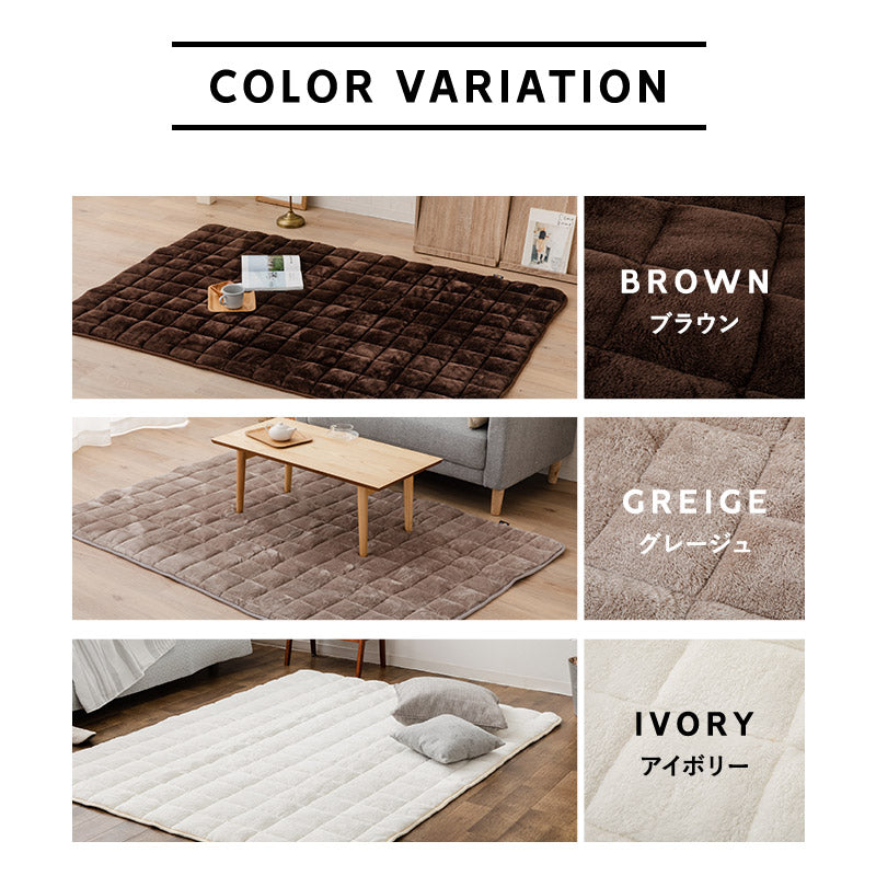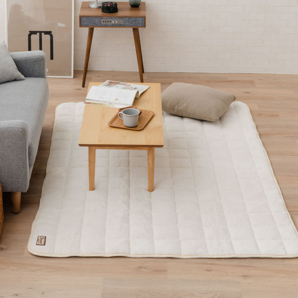 組成 | ■表地 ポリエステル100%(280g/m² ロングパイルフランネル8mm) ■グランド部分 ポリエステル50%、レーヨン50%(エムールヒートプラス使用) ■中材 ポリエステル100%、アルミシート ■裏面 不織布(スリッド加工) |